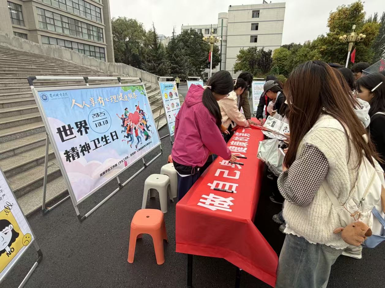 活动现场设置了专题展板,普及心理健康知识。针对学生对心理咨询存在的误解,心理健康教育与辅导中心教师耐心讲解,引导大家关注自我与他人情绪,勇于表达内心困惑,主动学习心理知识。师生互动积极,问答热烈,有效提升了学生的心理健康认知水平。同步开展的“做自己身心健康的第一责任人”宣誓签字活动得到师生积极响应,同学们在横幅上郑重签名,许下关注心理健康的庄严承诺。