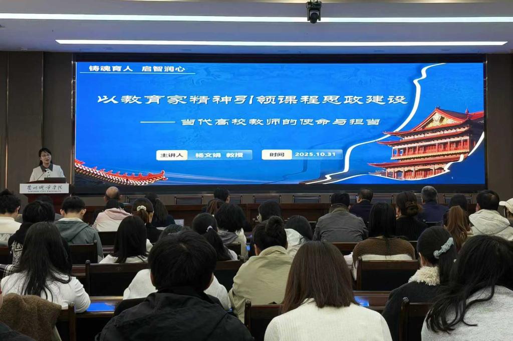 活动邀请环境与城市建设学院教师、学校师德先进个人杨文娟教授,以《以教育家精神引领课程思政建设——当代高校教师的使命与担当》为主题,分享了践行教育家精神的体会认识。她结合《建筑构造》课程教学实践,系统介绍了在专业课程中开展课程思政的经验做法。讲座内容深入浅出,案例详实,深刻阐释了教育家精神的核心内涵与时代价值,系统梳理了课程思政融入课堂教学的有效路径和实施方法,对提升教师育人能力和专业素养具有重要的理论指导意义和实践参考价值。