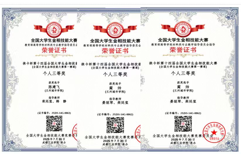 学科竞赛硕果累累:近年来,累计获“高教杯”全国大学生先进成图技术与产品信息建模创新大赛一等奖1项、二等奖1项,优秀指导教师2项,三等奖5项;获中国工程机器人大赛暨国际公开赛三等奖1项;获得中国国际大学生创新大赛甘肃省分赛银奖2项,三等奖2项;荣获全国大学生第十四届金相大赛省级一等奖2项、二等奖1项,国家三等奖3项;获全国大学生创新创业大赛优秀奖1项;获“挑战杯”甘肃省大学生课外学术科技作品竞赛二等奖2项,三等奖1项;获大学生英语竞赛三等奖2项;获十六届全国大学生数学竞赛三等奖1项,省级竞赛获奖共30余项。