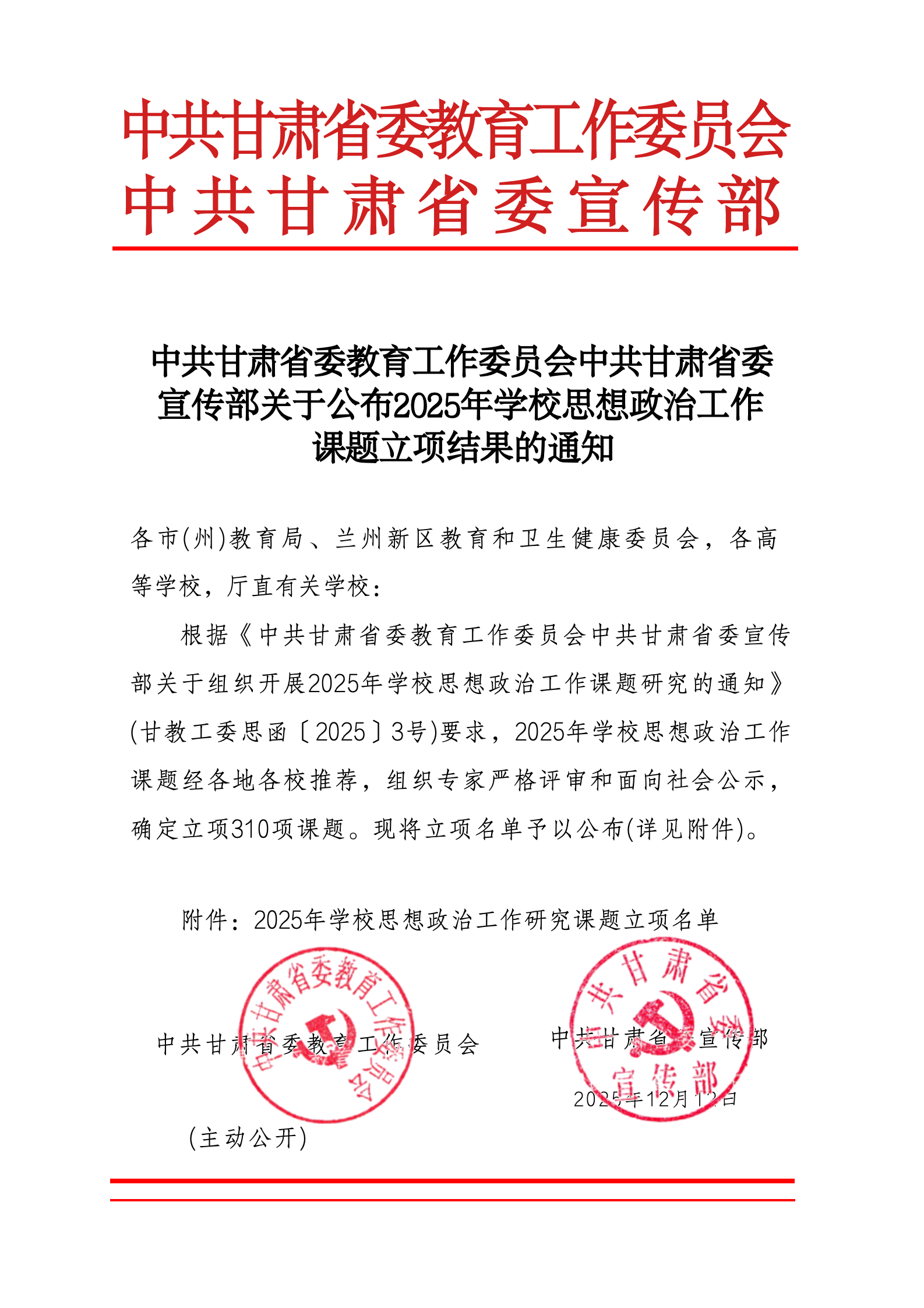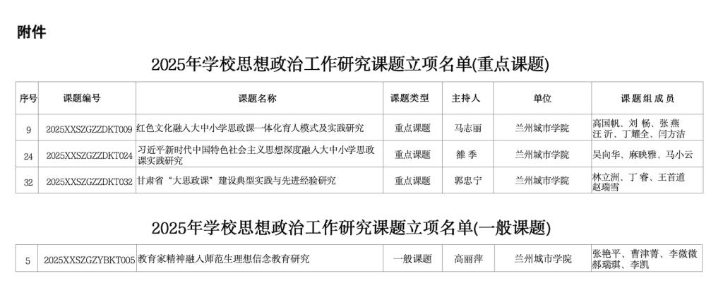 近日,甘肃省教育厅发布了《2025年学校思想政治工作研究课题立项名单》,学校马克思主义学院教师申报的3项课题获准立项为重点课题,教育学院教师申报的1项课题获准立项为一般课题