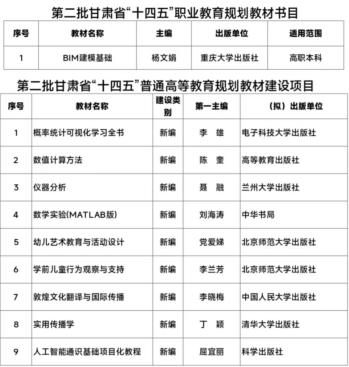 近日,甘肃省教育厅正式公布第二批“十四五”普通高等教育、职业教育教材书目和建设项目立项结果,点点官网共有1部教材获批“十四五”职业教育教材、9个项目入选省级规划教材建设项目。