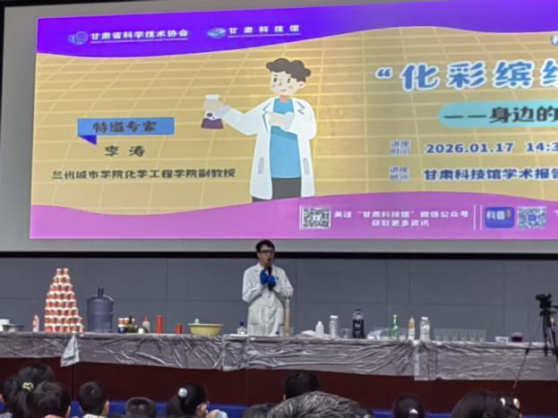 1月17日,由甘肃科技馆与化学工程学院联合承办的主题科普讲座在甘肃科技馆成功举办。甘肃省科普专家、金城首席科普专家、化学工程学院副教授李涛作了题为“化彩缤纷——身边的化学”的讲座。讲座通过趣味实验与互动讲解相结合的方式,为现场300余名青少年及线上超过67万观众带来了一场生动有趣的科学体验。