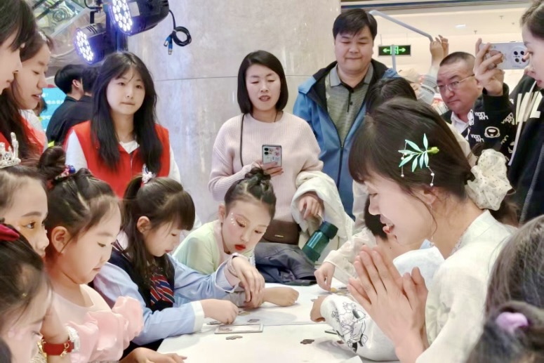 活动设置才艺展示、非遗剪纸走秀、马勺脸谱拼图、缠花体验等环节。工作坊学生在指导教师带领下,表演了《稻香》《开心往前飞》等歌曲及敦煌舞,并展示了精美剪纸作品。在拼图和缠花体验中,同学们与孤独症儿童一对一互动,耐心协助,帮助孩子们增强自信心、获得成就感。