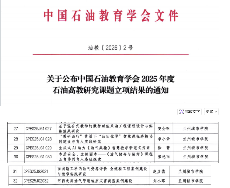 根据学会发布的《关于公布中国石油教育学会2025年度石油高教研究课题立项结果的通知》(油教〔20262号),本年度共立项理论类课题48项、案例类课题42项。学院教师主持的6项课题涵盖课程设计、智慧教学、育人模式、案例建设等多个方向。