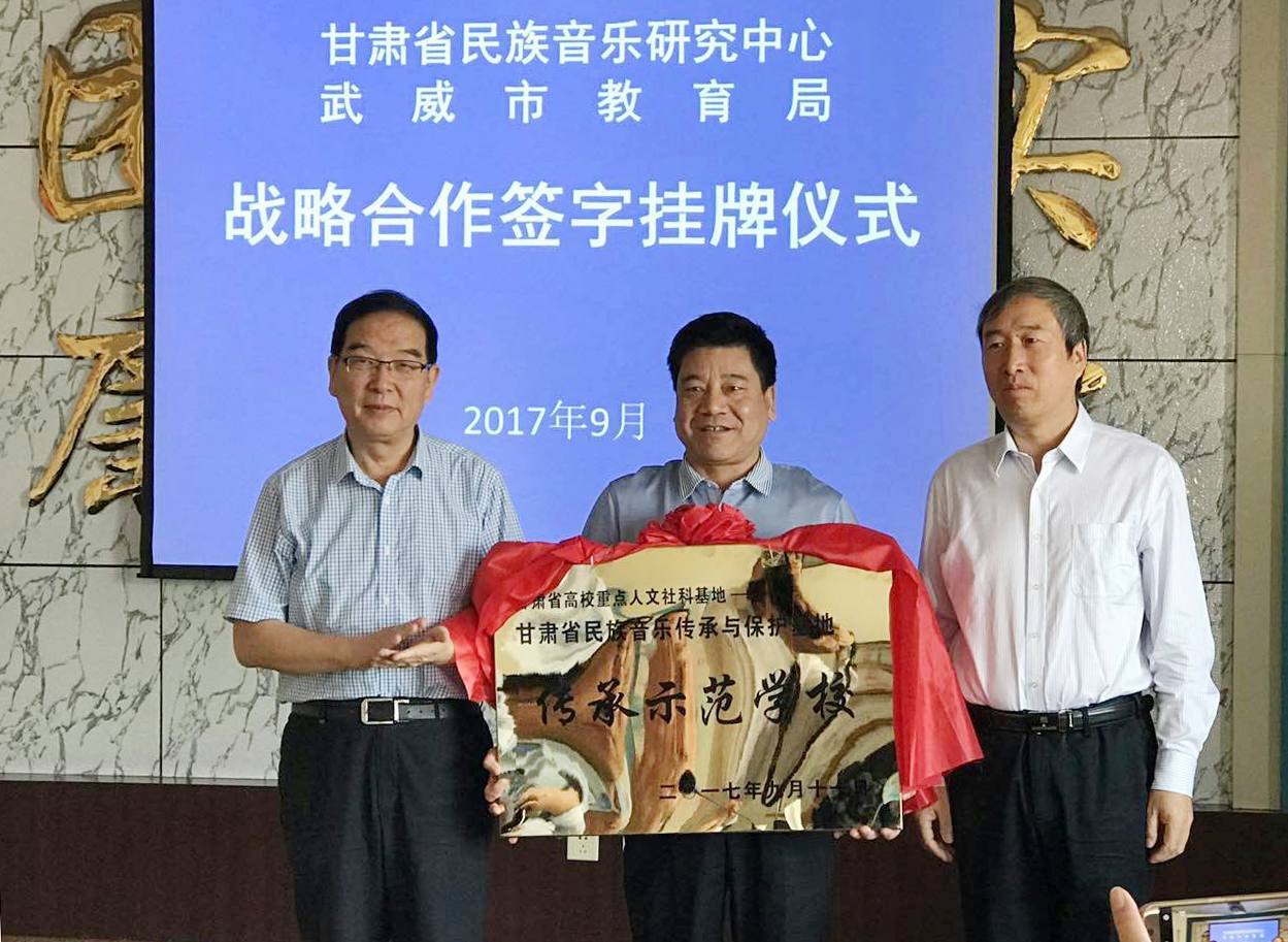 另讯,甘肃省高等学校人文社科重点研究基地——“示范传承学校”挂牌仪式于9月21日在武威市十八中学(原武威师范学校)进行。甘肃省民族音乐研究中心主任、重点研究基地负责人孔庆浩教授和武威市教育局党组书记、副局长蒋永红为“示范传承学校”揭牌;甘肃省手风琴学会会长、甘肃省民族音乐研究中心副主任王朝刚教授为武威市十八中学校长马生威颁发了研究基地研究员聘书。此次挂牌,对基地在拓展研究方向、开发研究领域、研究成果转换、非遗项目传承和落实省教育厅深化学校美育教学改革和发展方面将起到积极的引领和示范作用。