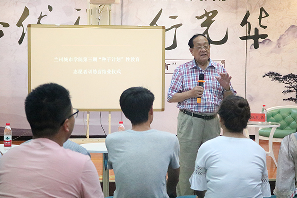 结业仪式上,党委宣传部、校团委邀请了中国性病艾滋病防治协会副会长张孔来教授为志愿者们作了题为《中国艾滋病流行与防治工作表状况》的专题讲座。张孔来用提问和引导的方式激发起同学们对艾滋病相关知识的浓厚兴趣,并通过师生的回答总结归纳了艾滋病的一些基础知识,向同学们普及了艾滋病传染源、传播途径、如何提高艾滋病预防能力和国家对艾滋病的“四免一关怀”等政策相关知识知识。