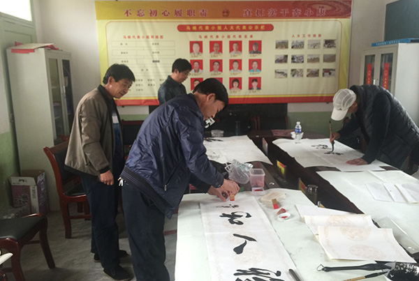 书协成员们先后在镇政府、寺咀村、邵咀村、马峡村给镇干部和村民们现场书写并赠送字画。在书写现场,村民们络绎不绝,创作气氛十分热烈。各位教师论书法之道、谈笔墨之境,笔走龙蛇,创作了350余幅书法作品,现场村民和干部不时爆发出阵阵掌声。