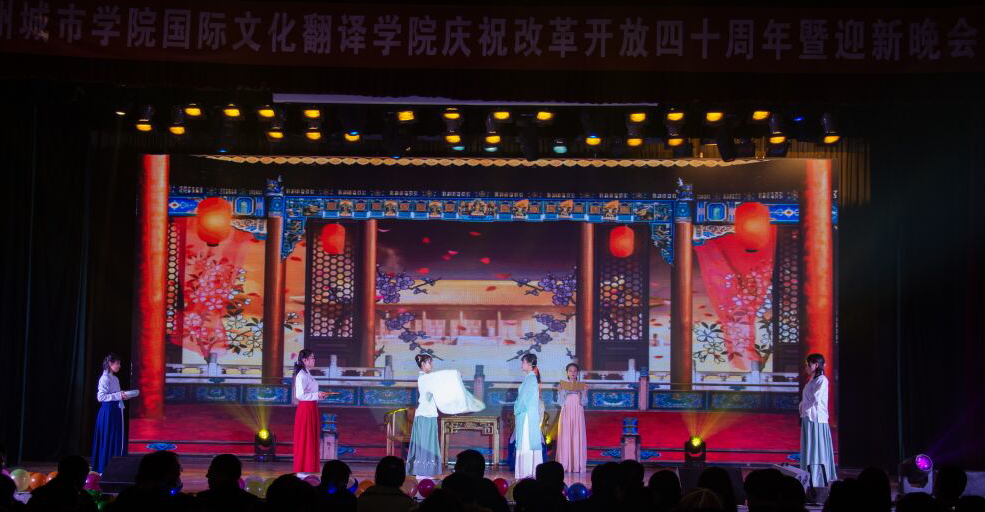 四十年的辉煌是一部厚重的历史画卷,四十年的伟绩是一曲高亢的世纪颂歌。12月27日晚,国际文化翻译学院“不忘初心紧跟党走,携手世界展望未来”庆祝改革开放40周年暨迎新晚会在学校大礼堂成功举办。副校长姜秋霞和相关部门负责人、各学院师生1500余人观看了晚会。