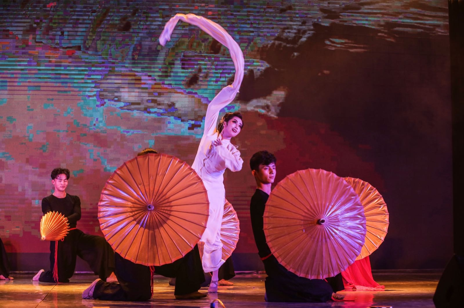 晚会共分为三个部分,分别是基础训练部分、古典舞部分和剧目部分。杨燕通过对教学事业的研究与沉淀,将中国传统的团扇、水袖、舞剑等元素配加到舞蹈编排当中,创造出了《丝绸韵舞》《裕固欢歌》《黄河母亲》等富有甘肃本土色彩的原创剧目,在传承了古典舞的神韵的同时,提炼出了独特的舞蹈语言、演绎体系和教学方式,为新年“舞”出了新气象。