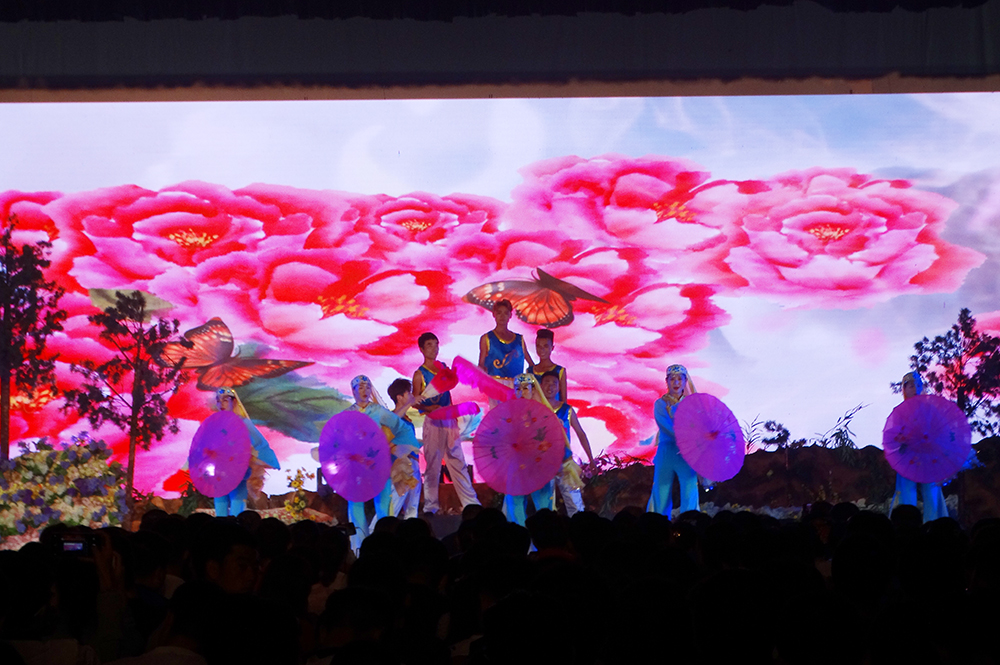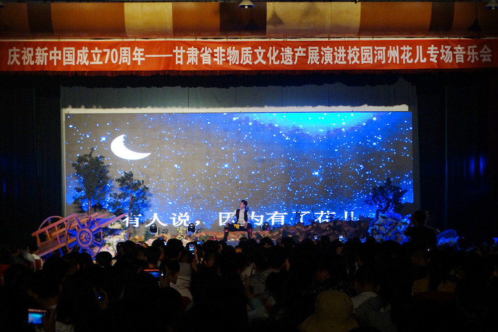 音乐会上,演员们载歌载舞、倾情演出,为师生奉上了一场精彩的视听盛宴。精彩的花儿对唱《山歌情爱》、花儿联歌联舞《松鸣云海花儿情》、舞蹈《魅力河州》《祈福大地》、秧歌表演《社火归来》、歌伴舞《花儿与少年》以及民俗表演《民歌联唱》相继上演,赢得了观众的阵阵掌声;原生态花儿演唱节目更是让观众耳目一新,引起了他们的极大兴趣。