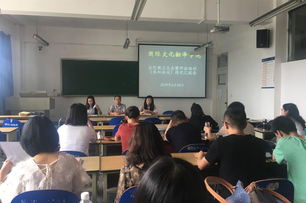 6月25日,国际文化翻译学院在学院党建阵地召开教职工大会,五位外出培训的教师代表分享了学习成果,学院全体教师参加了分享会。