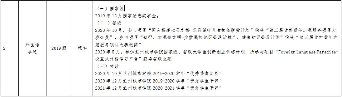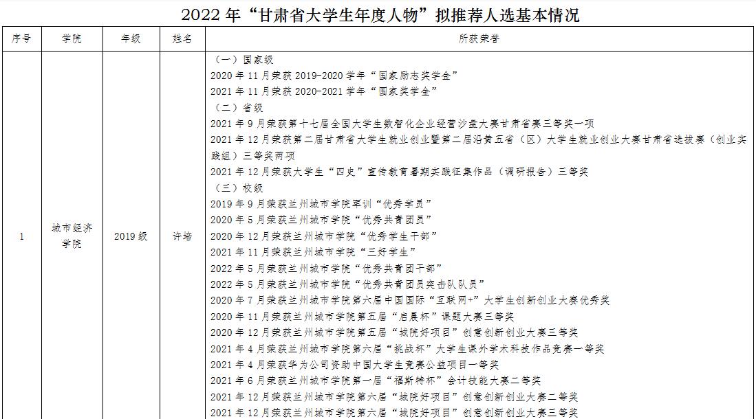 根据中共甘肃省委教育工作委员会《关于组织开展“2022甘肃省大学生年度人物”推选展示活动的通知》要求,经个人申报、学院推荐、学生工作处组织评审等程序,现将拟推荐人选予以公示,公示期自2022年6月26日至6月30日,如有异议,请向学生工作处反映,联系人:马鹏,电话:13919091990。