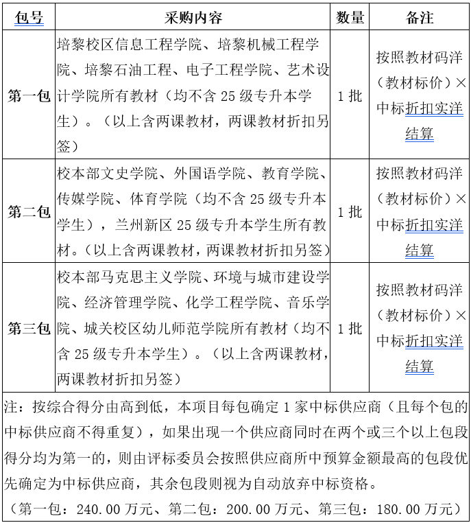 三、项目预算:620.00万元(本项目共分为三个包。其中:第一包:240.00万元;第二包:200.00万元;第三包:180.00万元。最高限价:教材折扣不高于 78%(即折扣率不低于22%)本项目设置最高限价,投标人所报价格不得高于最高限价,否则视为无效投标。)