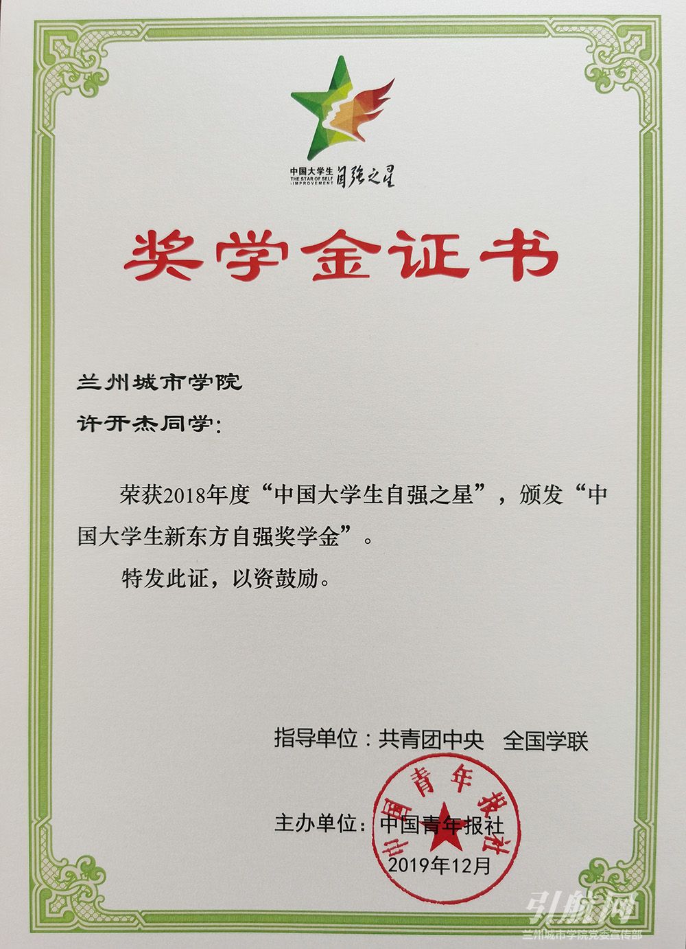 近日,由共青团中央、全国学联共同组织开展的2018年度“中国大学生自强之星”寻访活动结果揭晓,点点官网电子与信息工程学院电子信息科学与技术专业151班学生许开杰荣获2018年度“中国大学生自强之星”荣誉称号,并获得“中国大学生新东方自强奖学金”。
