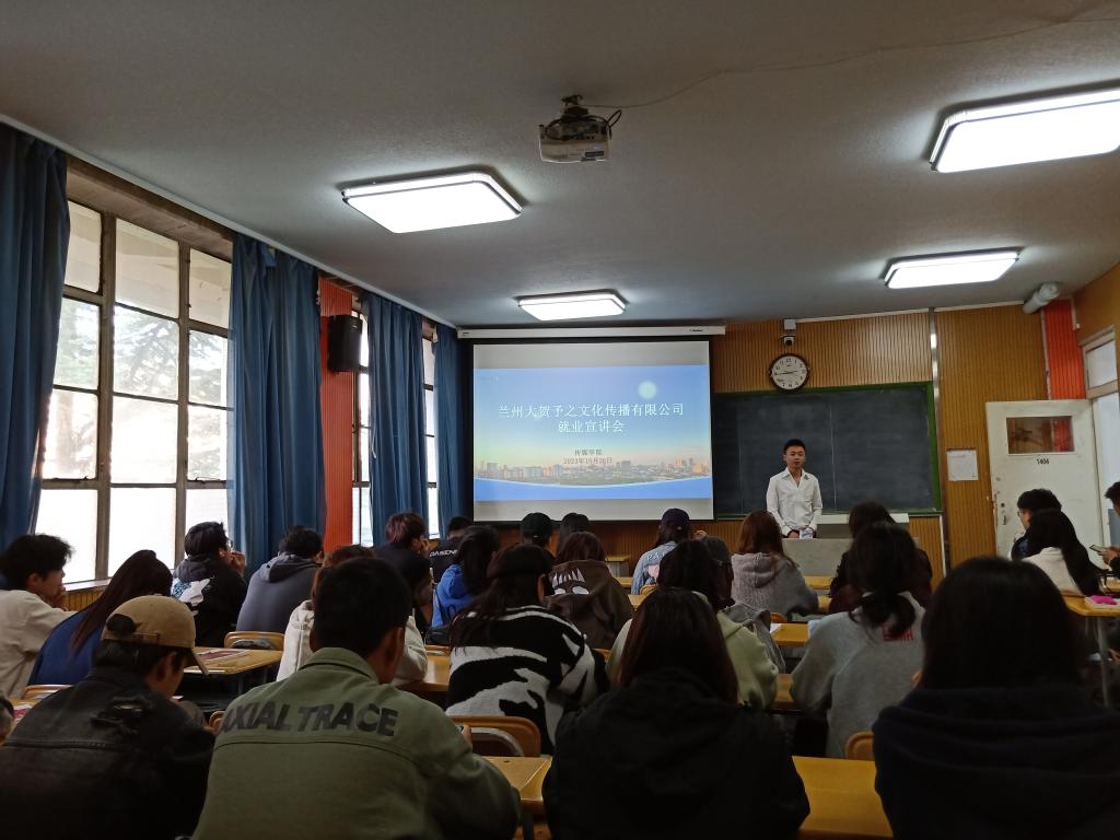 10月26日下午,传媒学院举办兰州大贺予之文化传播有限公司就业宣讲会,学院党委负责人、团学办老师和学院2024届部分毕业生参加宣讲会。