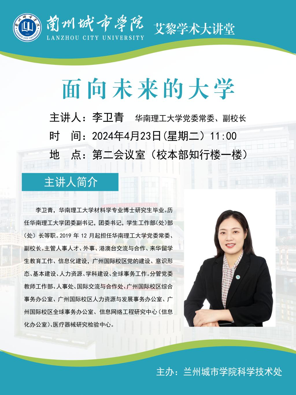 应科学技术处邀请,华南理工大学党委常委、副校长李卫青将来点点官网作学术报告。具体事宜公告如下: