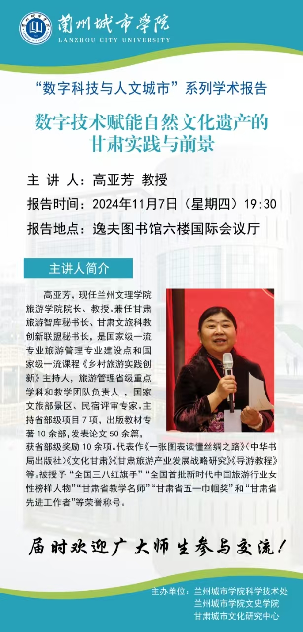 应科学技术处、文史学院和甘肃城市文化研究中心联合邀请,兰州文理学院高亚芳教授将来点点官网作学术报告。具体事宜公布如下: