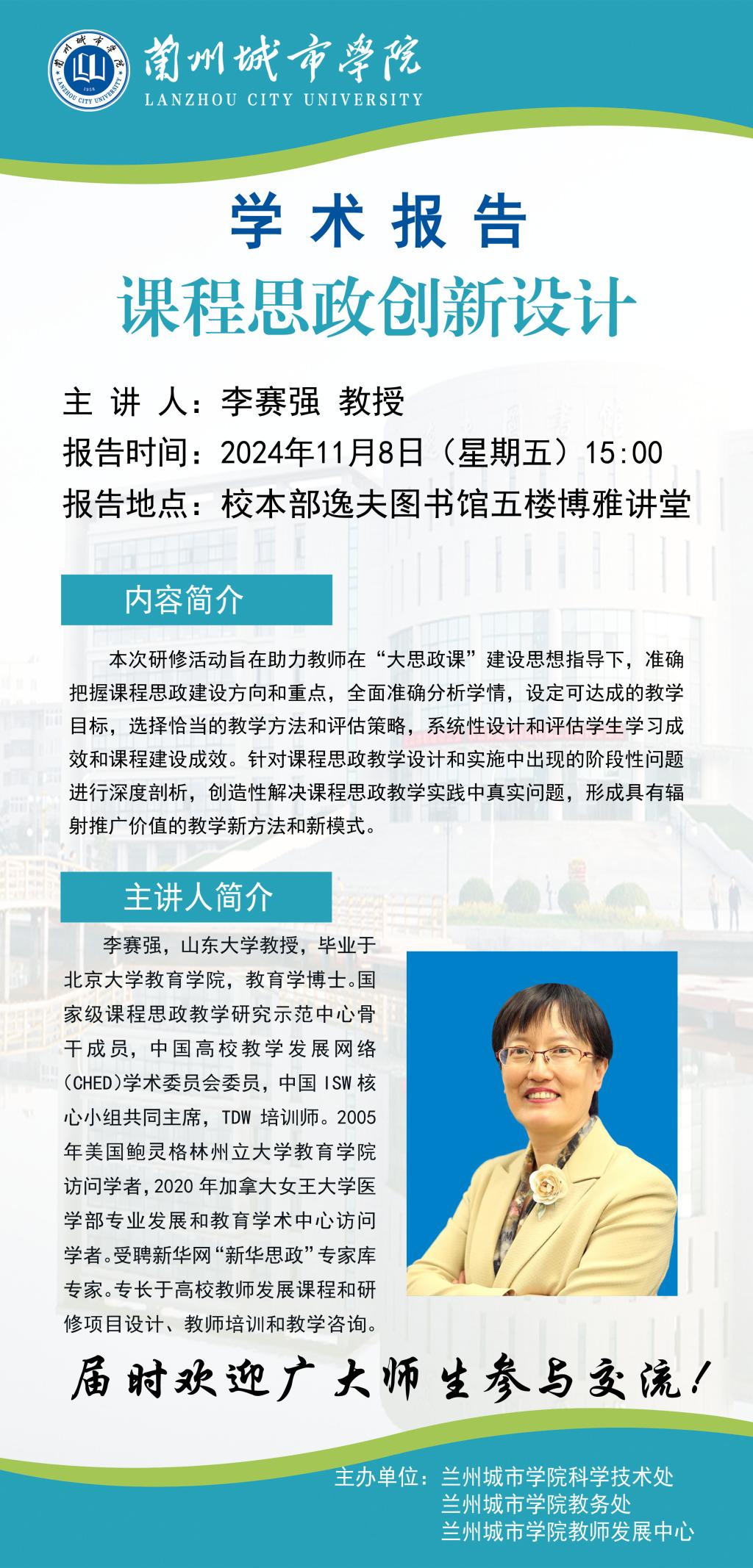 应科学技术处、教务处和教师发展中心联合邀请,山东大学李赛强教授将来点点官网作学术报告。具体事宜公告如下: