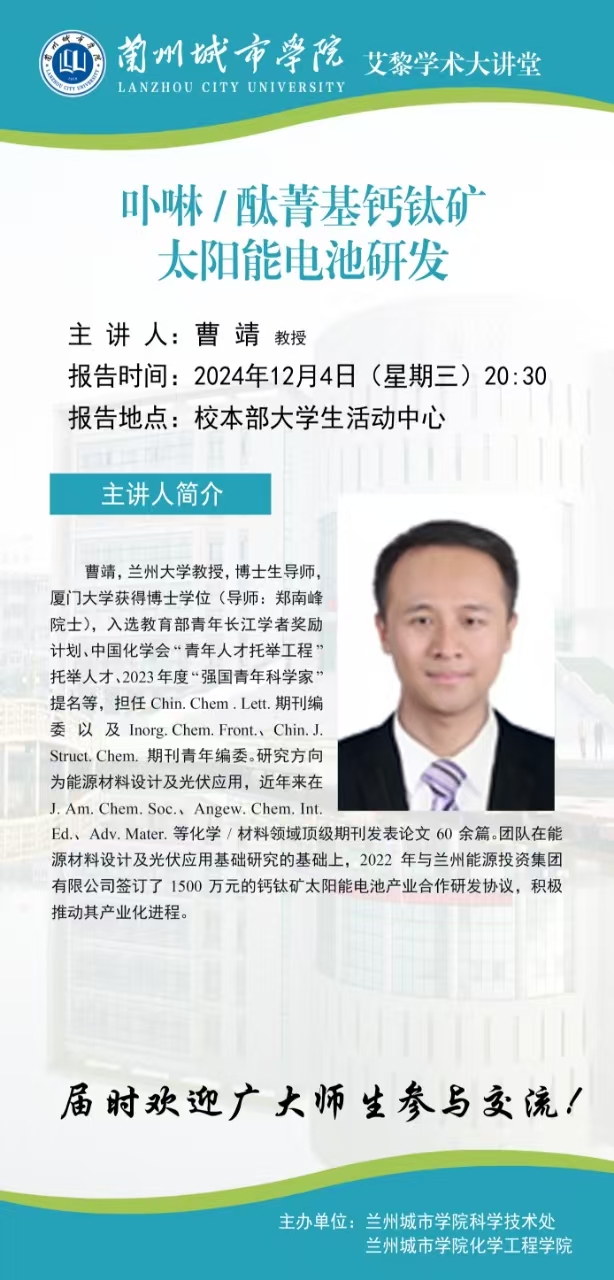应科学技术处和化学工程学院联合邀请,兰州大学曹靖教授将来点点官网作学术报告。具体事宜公告如下: