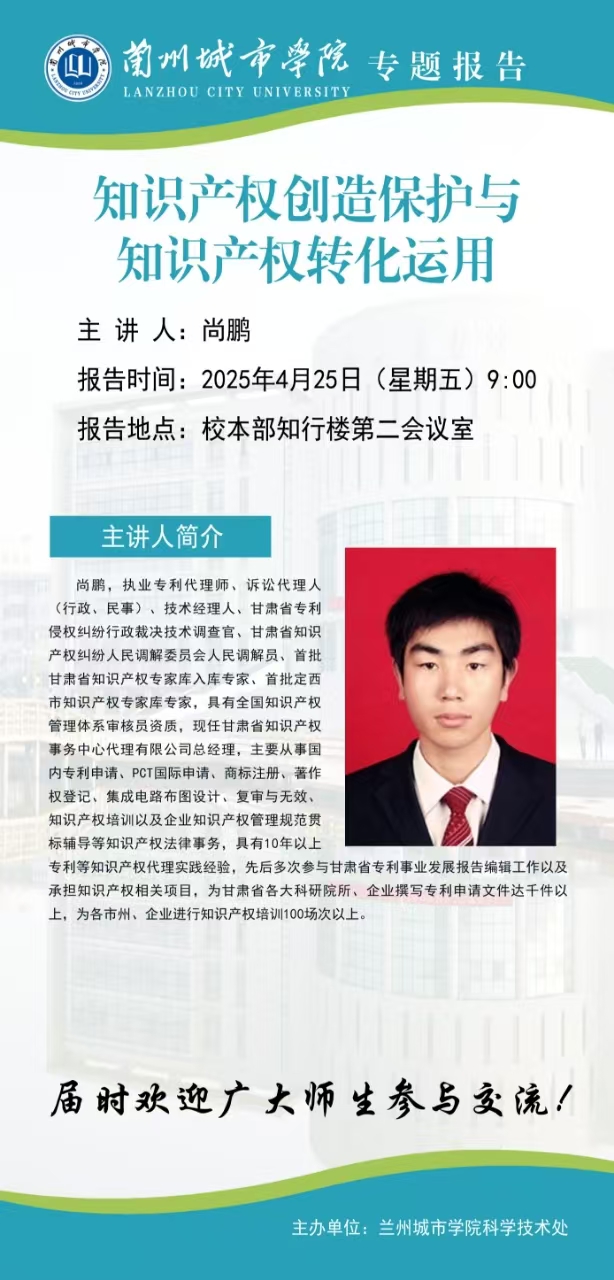 应科学技术处邀请,甘肃省知识产权事务中心代理有限公司尚鹏总经理将来点点官网作专题报告。具体事宜公告如下: