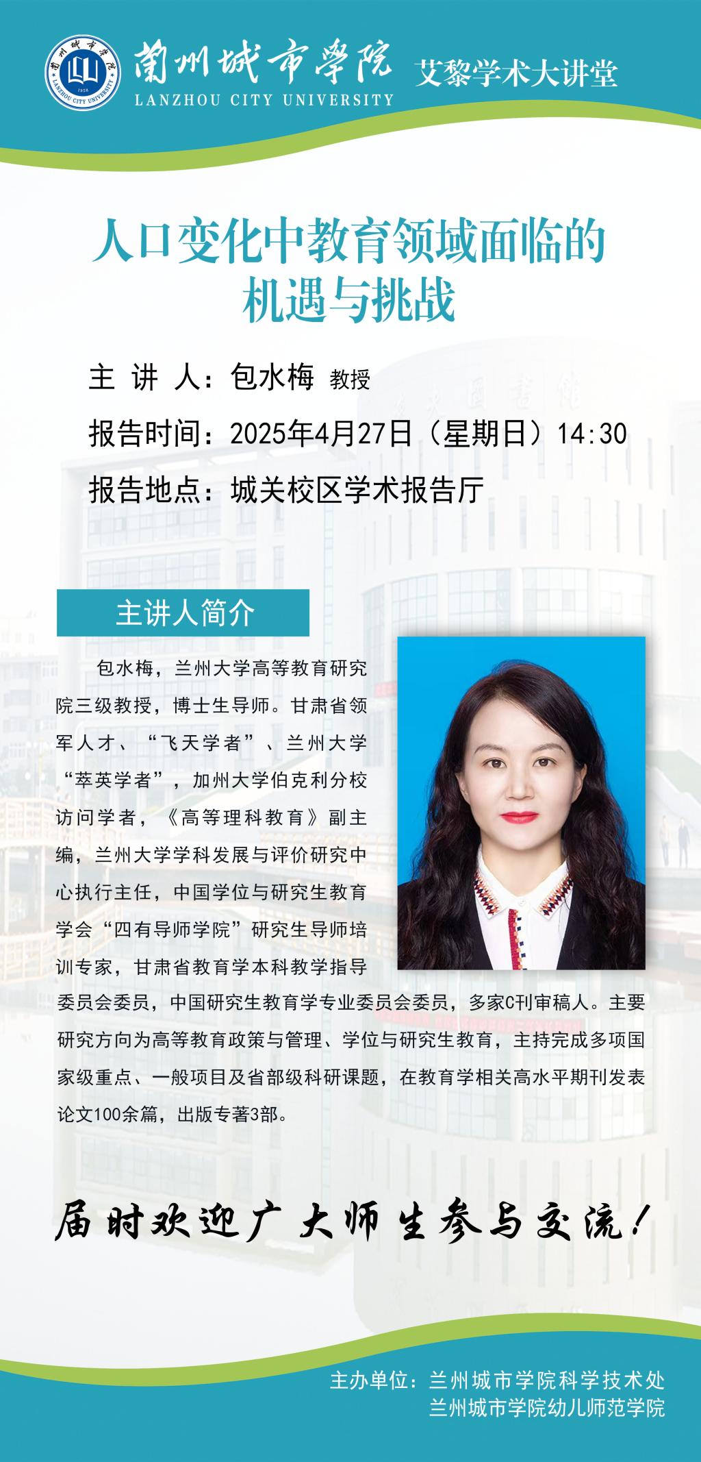 应科学技术处和幼儿师范学院联合邀请,兰州大学包水梅教授将为点点官网师生作学术报告。具体事宜公告如下: