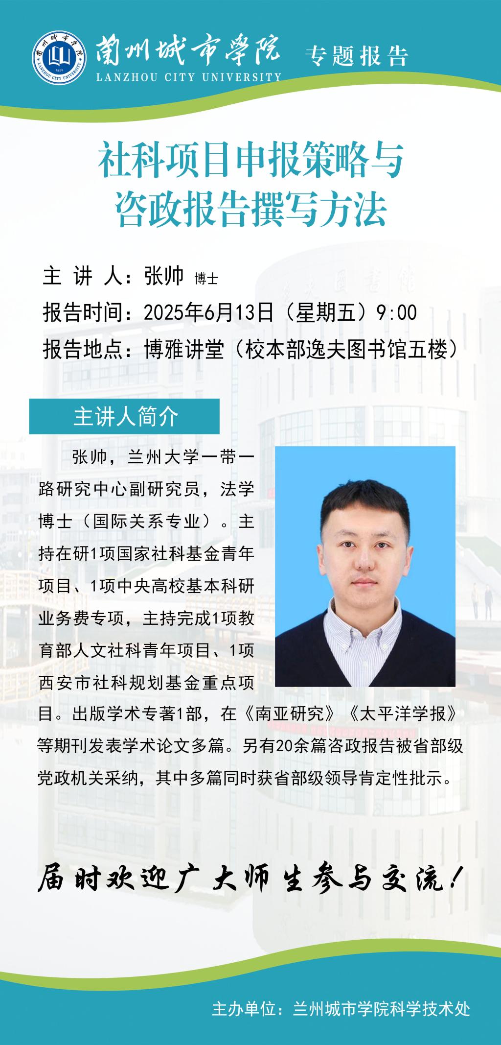 应科学技术处邀请,兰州大学张帅副研究员将来点点官网作专题报告。具体事宜公告如下: