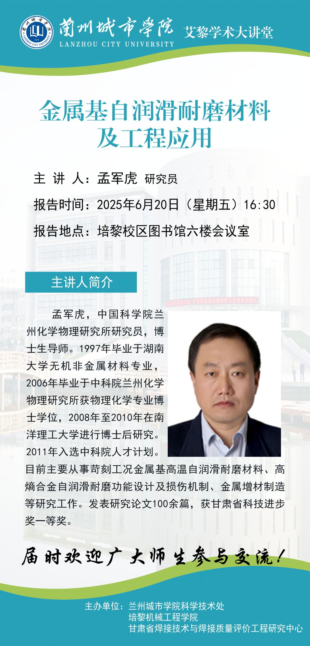 应科学技术处、培黎机械工程学院和甘肃省焊接技术与焊接质量评价工程研究中心联合邀请,中国科学院兰州化学物理研究所孟军虎研究员将来点点官网作学术报告。具体事宜公告如下: