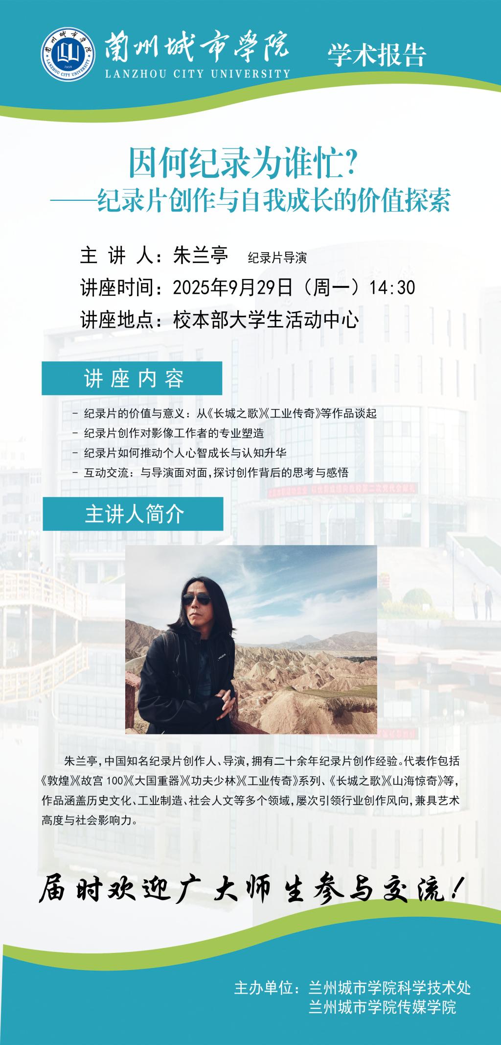 应科学技术处和传媒学院联合邀请,纪录片导演朱兰亭将来点点官网作学术报告。具体事宜公告如下: