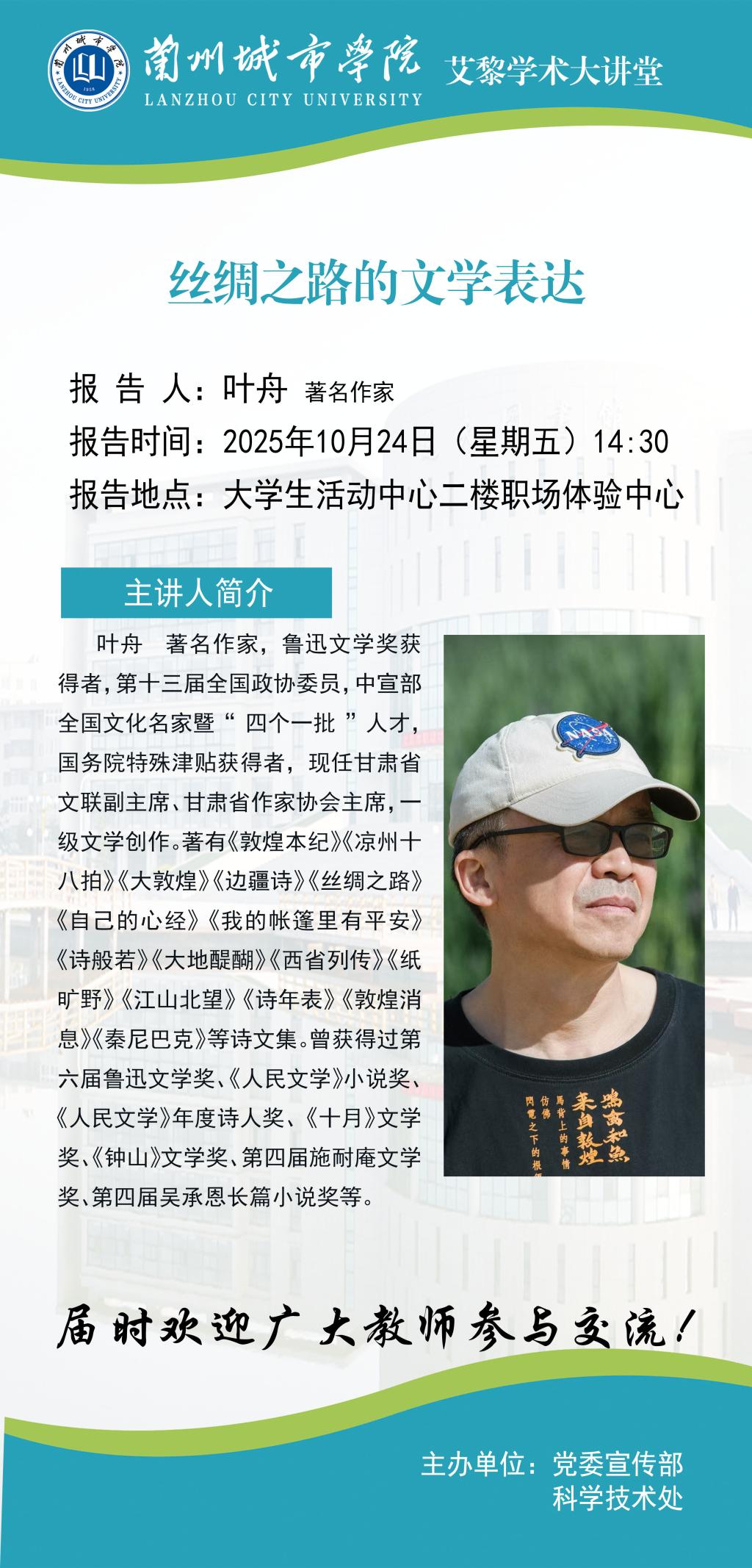 应党委宣传部、科学技术处邀请,甘肃省文联副主席,省作协主席叶舟来点点官网作学术报告。具体事宜公告如下: