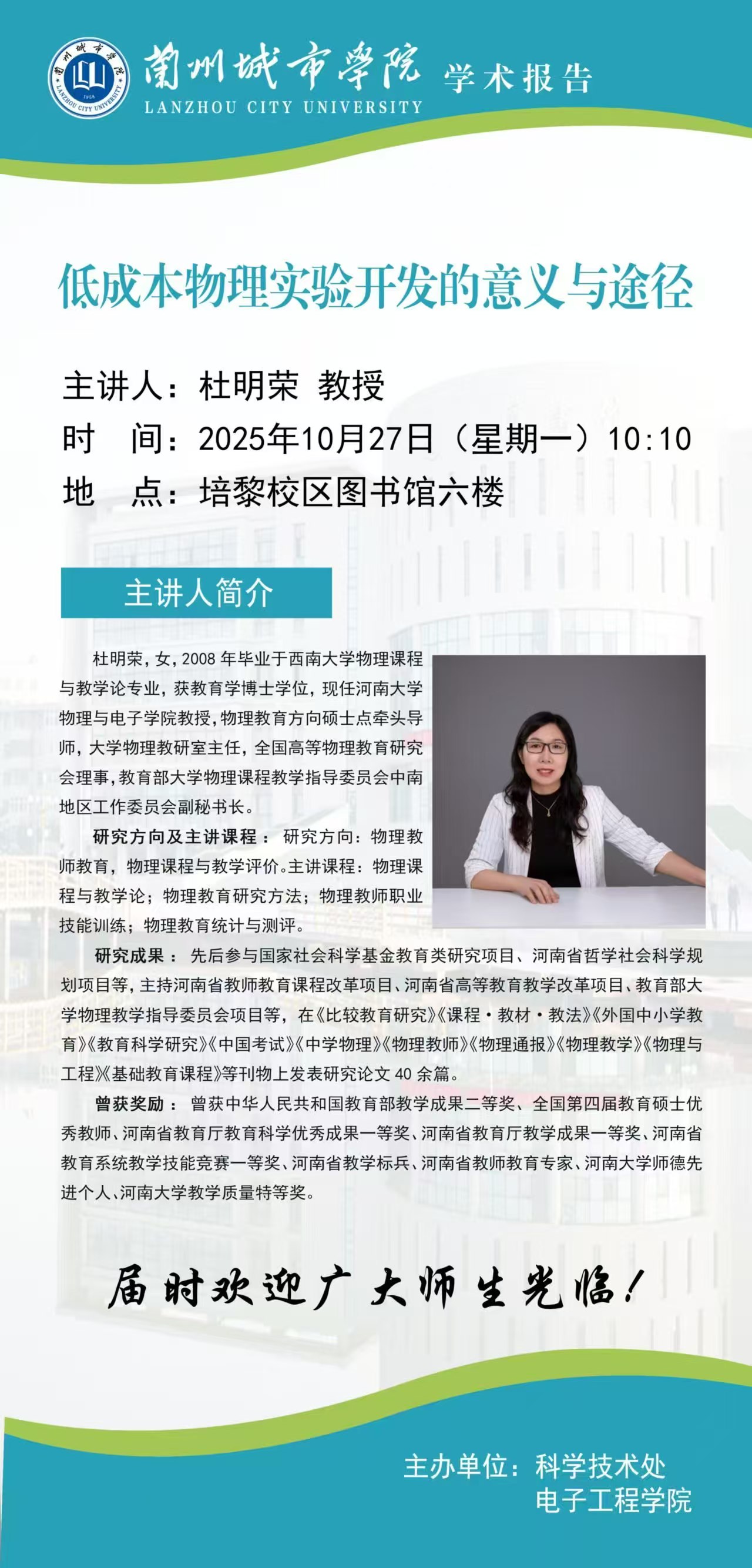 应科学技术处、电子工程学院联合邀请,河南大学杜明荣教授来点点官网作学术报告。具体事宜公布如下: