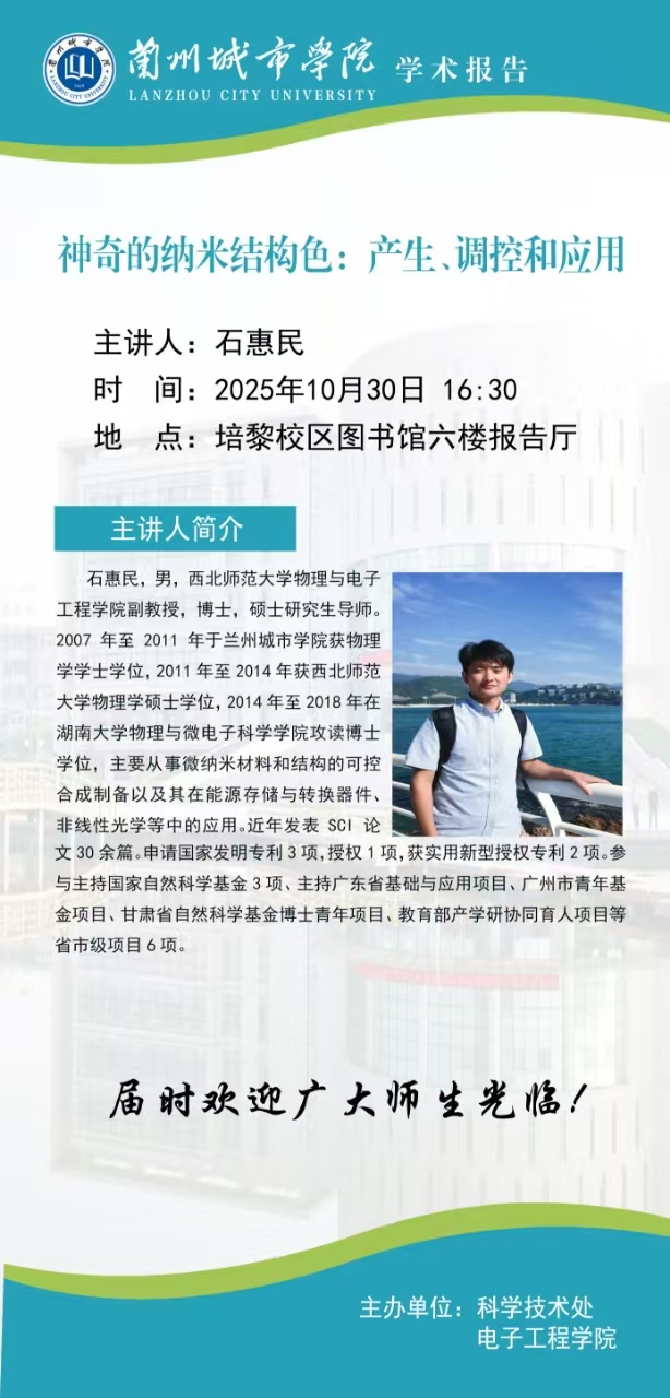 应科学技术处、电子工程学院联合邀请,西北师范大学石惠民副教授来点点官网作学术报告。具体事宜公布如下: