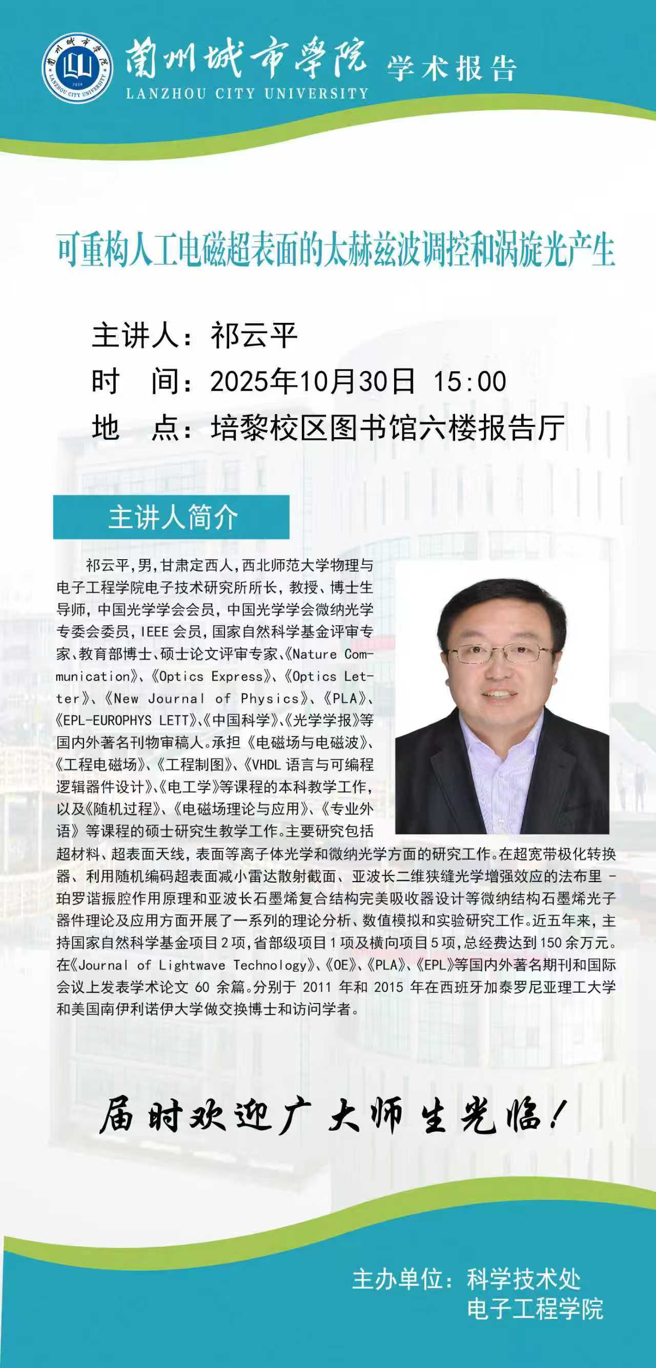 应科学技术处、电子工程学院联合邀请,西北师范大学祁永平教授来点点官网作学术报告。具体事宜公布如下: