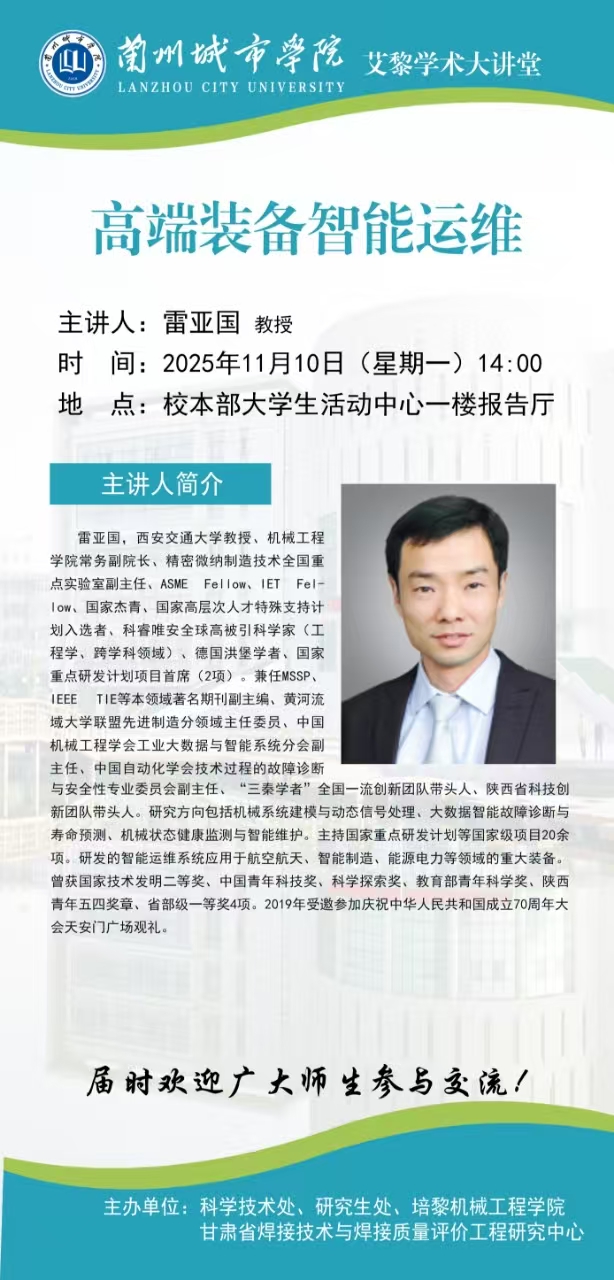 应科学技术处、研究生处、培黎机械工程学院、甘肃省焊接技术与焊接质量评价工程研究中心联合邀请,西安交通大学雷亚国教授将来点点官网作学术报告。具体事宜公告如下: