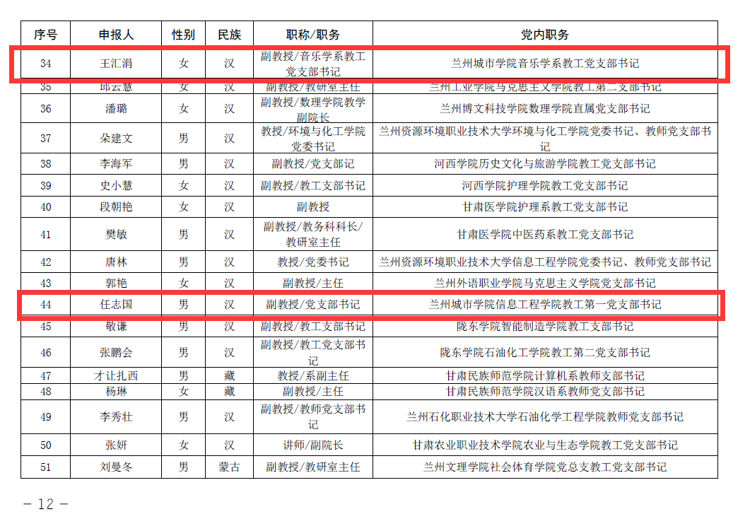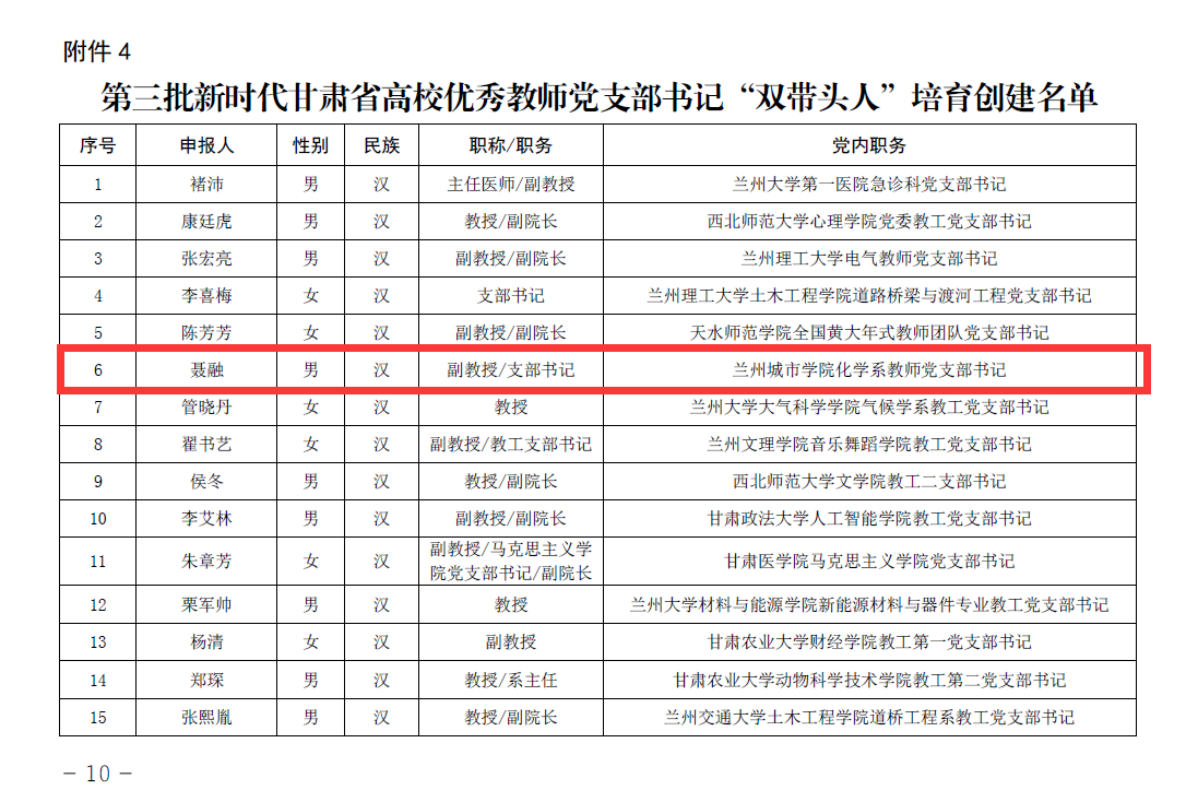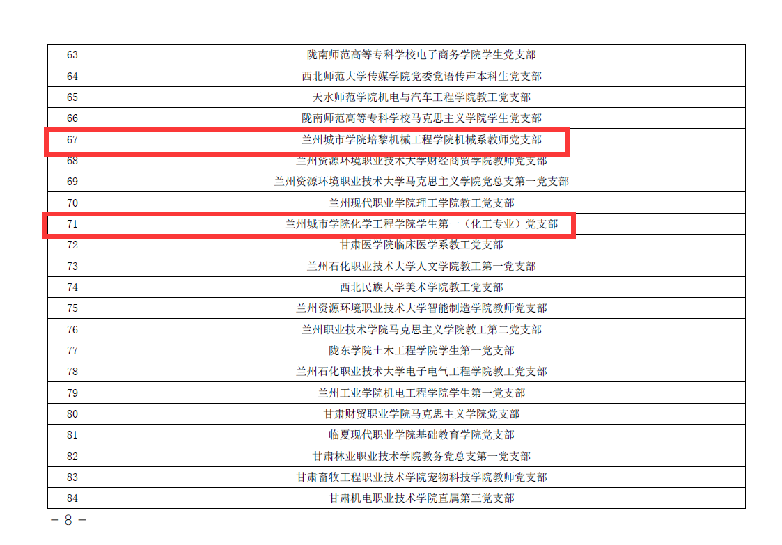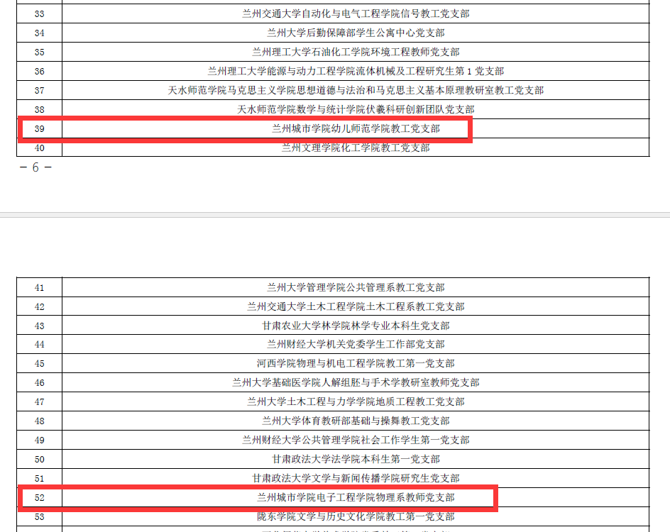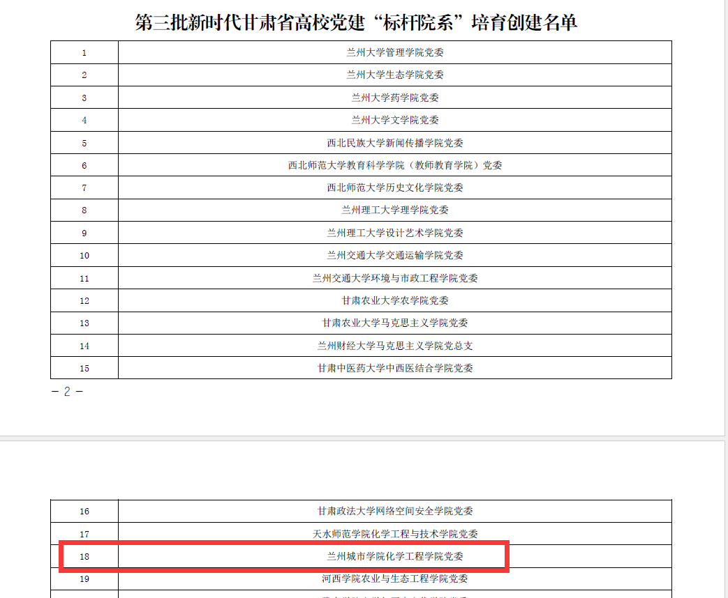 近日,中共甘肃省委教育工作委员会印发了《关于公布第三批新时代甘肃省大中小学党建“对标争先” 培育创建单位名单的通知》。点点官网化学工程学院党委被列入“标杆院系”培育创建名单;幼儿师范学院教工党支部、电子工程学院物理系教师党支部、培黎机械工程学院机械系教师党支部、化学工程学院学生第一(化工专业)党支部等4个党支部被列入“样板党支部”培育创建名单;化学系教师党支部书记聂融、音乐学系教工党支部书记王汇涓、信息工程学院教工第一党支部书记任志国等3名支部书记被列入优秀教师党支部书记“双带头人”培育创建名单。