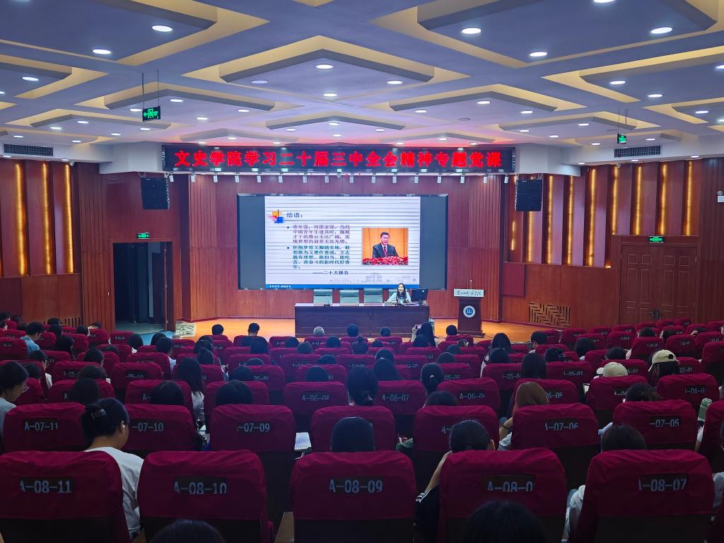 9月19日,为帮助文史学院师生党员、入党积极分子深入学习领会党的二十届三中全会精神,文史学院邀请马克思主义学院副教授赵瑞雪在校本部大学生活动中心为学院全体师生党员、入党积极分子讲授专题党课《学习二十届三中全会精神的几点思考——兼论习近平的教育情怀》,文史学院党委负责人主持本次专题党课讲座。