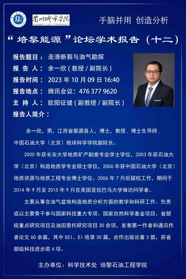 10月9日,中国石油大学(北京)教授余一欣应邀为培黎石油工程学院“培黎能源”论坛作了题为《走滑断裂带与油气勘探》的线上学术报告,会议由学院负责人主持,taptap点点、中国石油大学(北京)等科研院所共计150余人参加了此次会议。