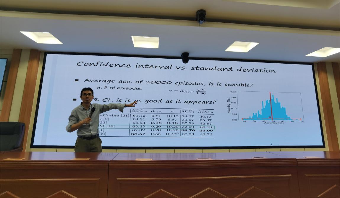 吴建鑫以《当小样本学习遇到视觉大模型》为题,围绕经典FSL、预训练模型、预学习模型、预训练冻结模型展开阐述,充分证明了即使在小型数据集上进行预训练,也可以促进对大规模数据集的训练,并就图片识别和图片生成以及相关的算法等予以详细说明。报告观点新颖,内容充实,数据详实。会上,吴建鑫就图片识别和图片生成、AI引起的学术道德等问题与参会教师展开了讨论交流。
