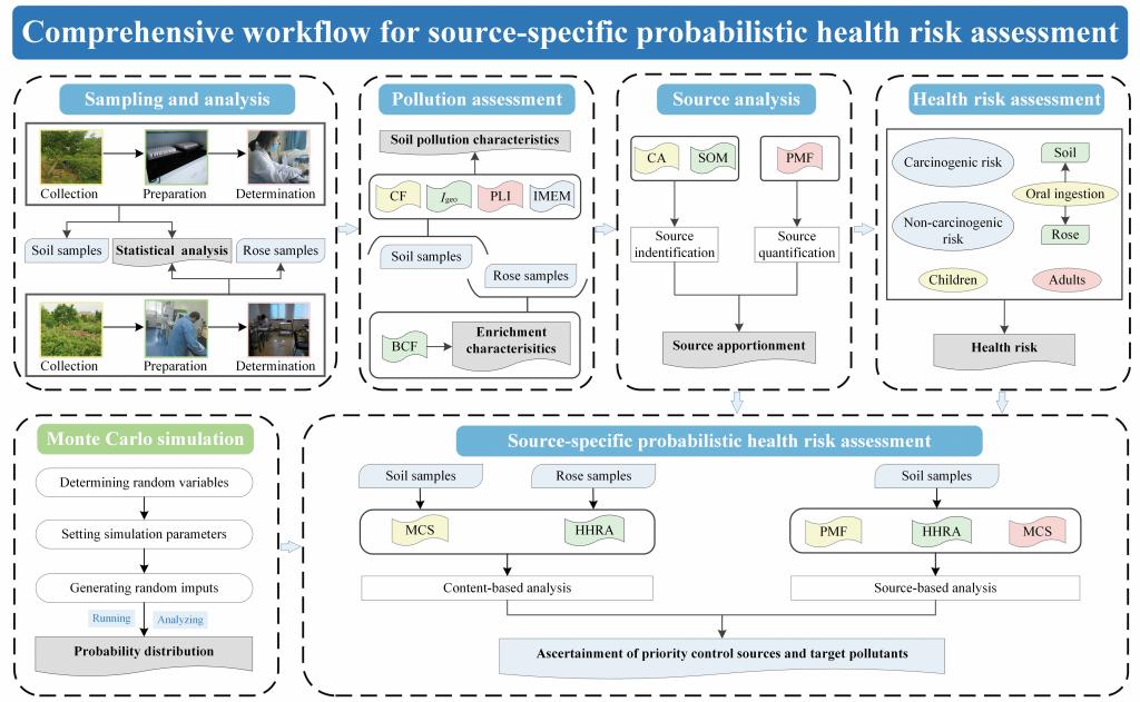土壤环境质量直接关系到农产品安全与公众健康。团队将研究视角转向了我国著名的“玫瑰之乡”——兰州苦水镇的土壤-玫瑰种植系统。针对传统评价方法在评估复杂土壤污染时的局限性,团队引入并优化了物元可拓模型(IMEM),结合多种传统指数,对玫瑰种植区土壤的重金属污染等级进行了更精准、更客观的综合评价。研究结果显示,苦水玫瑰产地土壤总体上处于尚清洁状态,土壤重金属来源复杂,汞(Hg)主要受工业-燃煤源和交通源的共同影响;镉(Cd)主要受农业源的影响;锌(Zn)主要受交通源和农业源的复合影响;砷(As)、铬(Cr)、铜(Cu)、镍(Ni)和铅(Pb)主要受工业活动产生的大气沉降源的影响。土壤重金属对当地人群具有潜在的致癌健康风险,但玫瑰重金属处于安全阈值内。研究进一步明确,自然-交通源是构成人体健康风险的首要贡献者,其中Cr和Ni是需要优先管控的关键污染物。研究结果可为苦水玫瑰种植地土壤重金属污染的风险管控和苦水玫瑰产业的高质量可持续发展提供科学的理论依据。