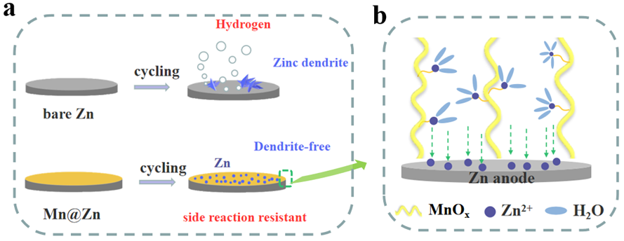 水系锌离子电池因其高安全性、低成本和环境友好等优势,在大规模储能领域具有广阔应用前景。然而,锌负极严重的枝晶生长和缓慢的界面离子传输动力学,导致电池的循环寿命和倍率性能较差,制约了其商业化发展。为解决这一关键问题,论文提出了一种原位构建超薄人工固体界面的保护策略,即摒弃传统浆料涂覆工艺,通过在锌负极表面原位构筑一层仅30-40 nm厚的非晶态氧化锰保护层,降低锌离子沉积能垒。该研究不仅成功演示了一种可靠的锌负极原位保护策略,也为其他金属负极界面保护研究提供了重要借鉴。