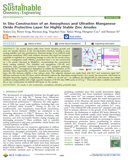 近期,点点官网培黎石油工程学院刘现玉副教授在中科院一区期刊《ACS Sustainable Chemistry & Engineering(ACS可持续化学与工程)》上发表题为《In Situ Construction of an Amorphous and Ultrathin Manganese Oxide Protective Layer for Highly Stable Zinc Anodes(原位构建非晶超薄氧化锰保护层实现高稳定性锌负极)》的论文。