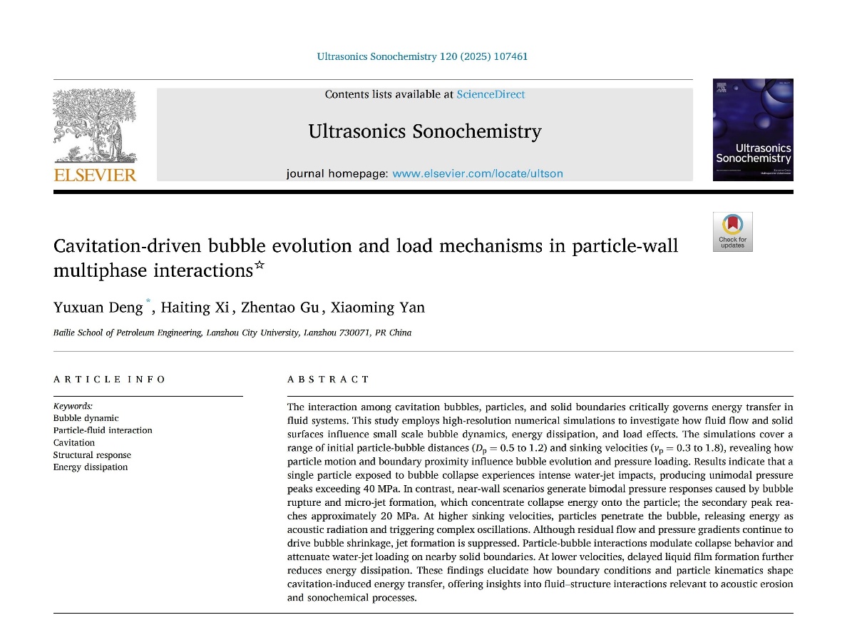 近期,学校培黎石油工程学院邓育轩副教授在中科院一区期刊《Ultrasonics Sonochemistry(超声化学)》上发表题为:《Cavitation-driven bubble evolution and load mechanisms in particle-wall multiphase interactions(颗粒-壁面多相流中空化气泡演化及载荷机理)》的论文,利用高分辨率数值模拟,揭示了空化气泡在颗粒和壁面之间塌陷时的独特演化机制。