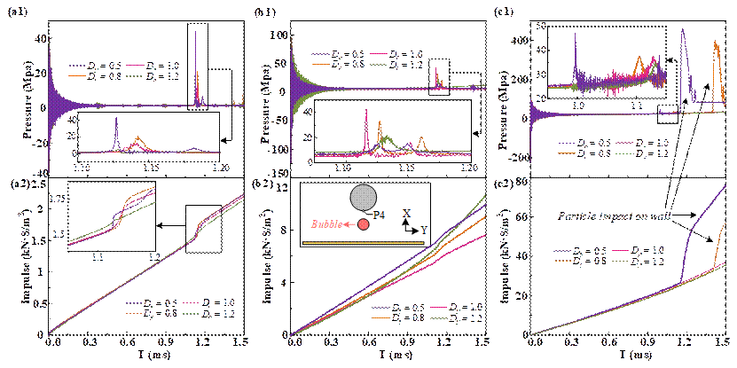研究发现,空化气泡与颗粒、壁面间的相互作用会引发复杂且影响显著的物理现象:当空化气泡在固体颗粒附近塌陷时,会产生强烈的水射流冲击,宛如“液体长矛”。研究表明,这一过程能产生高达40 MPa的单峰压力,这种强大的冲击力足以对固体颗粒造成明显影响。若空化气泡的塌陷过程受到壁面限制,情况则更为复杂。此时,气泡塌陷会先产生主冲击,随后伴随微射流形成二次冲击,压力曲线呈现双峰特征,其中二次峰值接近20 MPa。这意味着能量被集中释放于颗粒和壁面之间,使冲击效应更为持久。颗粒的运动状态也会显著影响空化气泡的塌陷行为。当颗粒下沉速度足够高时,会直接“穿透”空化气泡,导致塌陷能量以声辐射的形式释放。这一过程削弱了高速水射流对壁面的破坏作用,使空化气泡不再形成典型的喷射,而是转变为复杂的振荡过程。相反,在颗粒下沉速度较低时,颗粒与空化气泡之间的液膜形成会被延迟,能量耗散随之减弱。这使得气泡塌陷的能量能够保持更长时间,从而对颗粒和壁面产生持续的作用。这种“微爆炸”现象虽然会引发材料表面的侵蚀损伤,但在超声清洗、声化学反应以及能源利用等领域中,却发挥着不可或缺的重要作用。