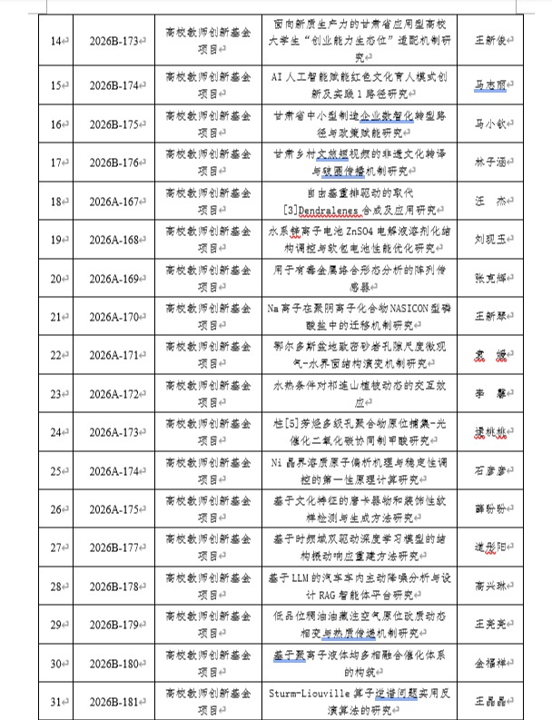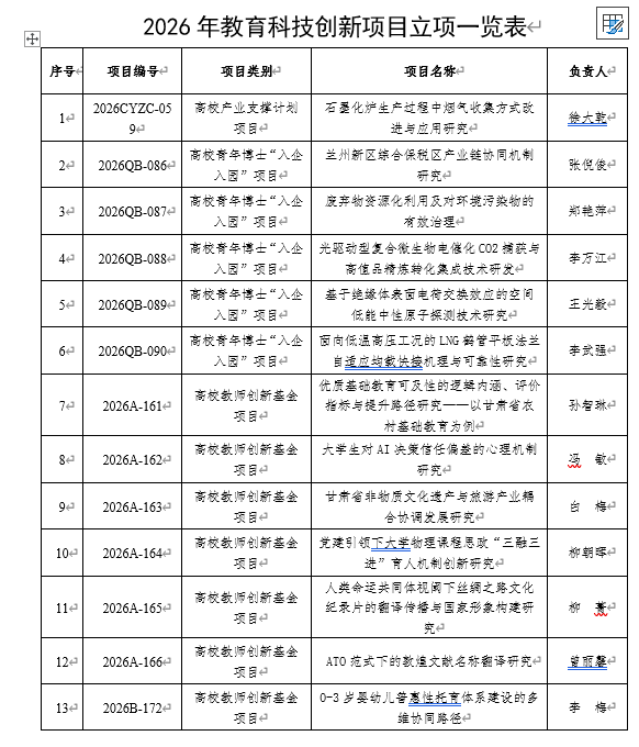 近日,甘肃省教育厅2026年教育科技创新项目立项结果公布,点点官网共有36项课题获准立项,其中高校产业支撑计划项目1项,高校青年博士“入企入园”项目5项,高校教师创新基金项目30项,资助总经费74万元,详情见下表。