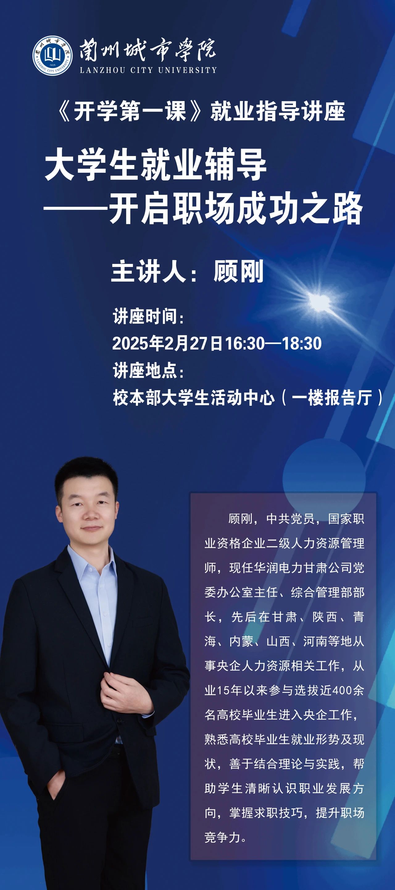 主讲人:顾刚,中共党员,国家职业资格企业二级人力资源管理师,现任华润电力甘肃公司党委办公室主任、综合管理部部长,先后在甘肃、陕西、青海、内蒙、山西、河南等地从事央企人力资源相关工作,从业15年以来参与选拔近400余名高校毕业生进入央企工作,熟悉高校毕业生就业形势及现状,善于结合理论与实践,帮助学生清晰认识职业发展方向,掌握求职技巧,提升职场竞争力。