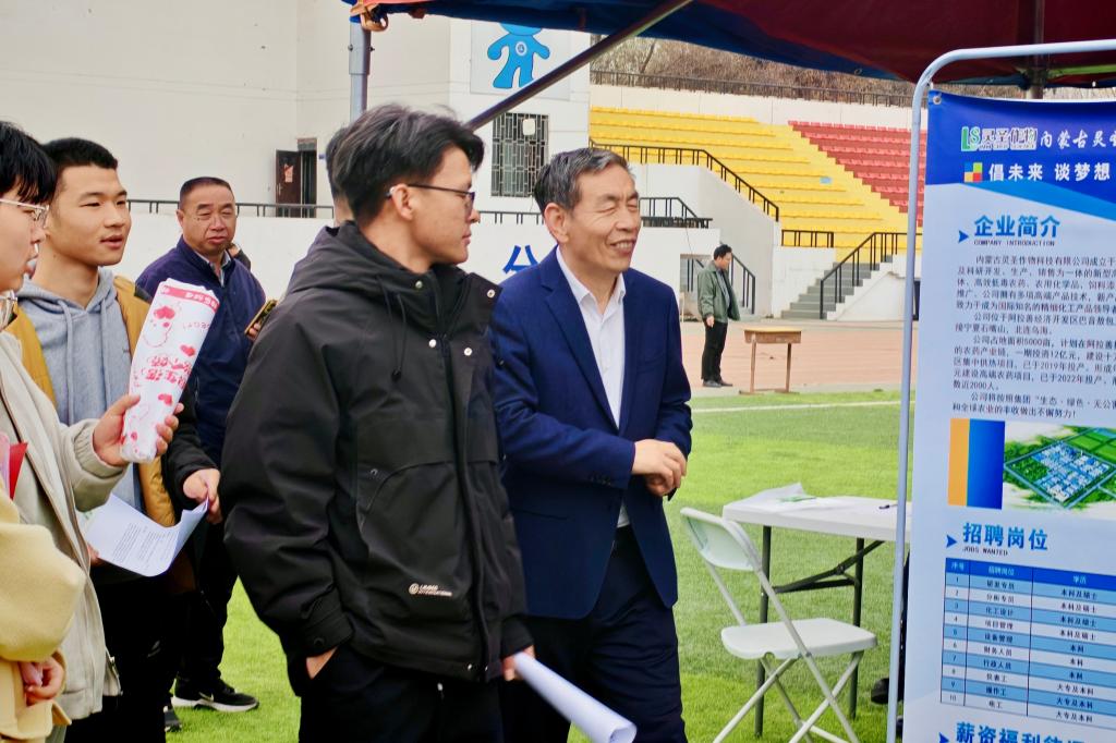 校党委常委、副校长李慕堂到现场调研指导,与地方政府招聘团和用人单位代表交流,了解招聘需求、往年录用情况及人才培养建议,并询问参会学生求职意向,鼓励他们结合专业特长与社会需求,找准职业定位,积极展示自我。