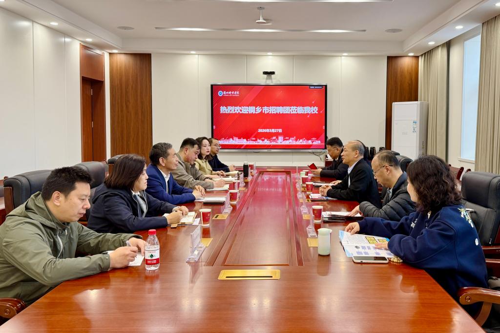 座谈会上,李慕堂详细介绍了学校办学历史、师资力量、毕业生整体情况。他表示,学校致力于培养高素质应用型人才,学科专业方向与桐乡市重点产业需求高度契合,双方合作前景广阔。李慕堂提出三点期望:一是深化人才供需对接,常态化开展专场招聘、实习实训;二是拓展产学研协同创新,开展联合攻关、成果转化、人才共育;三是建立长效合作机制,在人才引育、就业跟踪等方面形成全过程、闭环式合作体系,让“桐乡引才”成为校地协同发展的典范品牌。商国明详细介绍了桐乡市的人文地理、产业布局及引才政策。他表示,桐乡作为长三角一体化发展的前沿阵地,产业基础扎实、创新活力强劲,对应用型人才需求迫切。学校学科专业设置与桐乡重点产业方向高度匹配,双方合作空间广阔,期待通过常态化沟通机制,推动校地在人才引育、实习实训、毕业生就业等方面实现更深层次合作。双方围绕校地合作事宜进行了深入交流,并就建立长效合作机制达成共识。